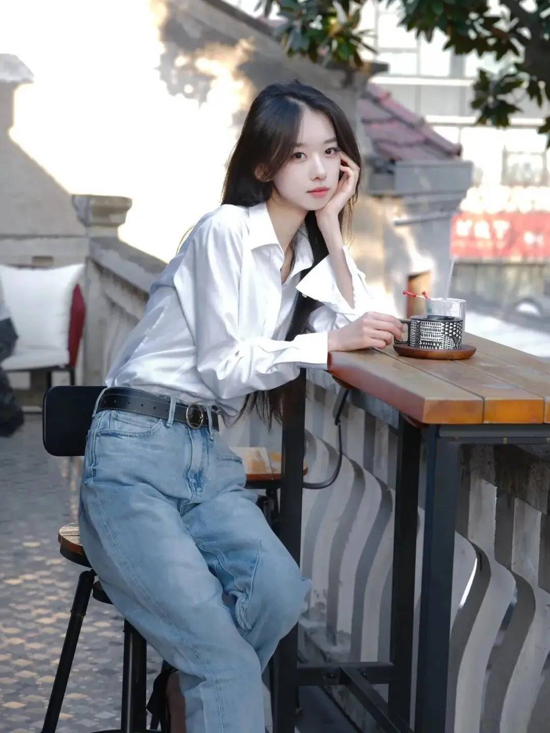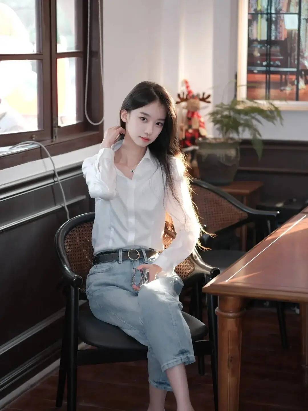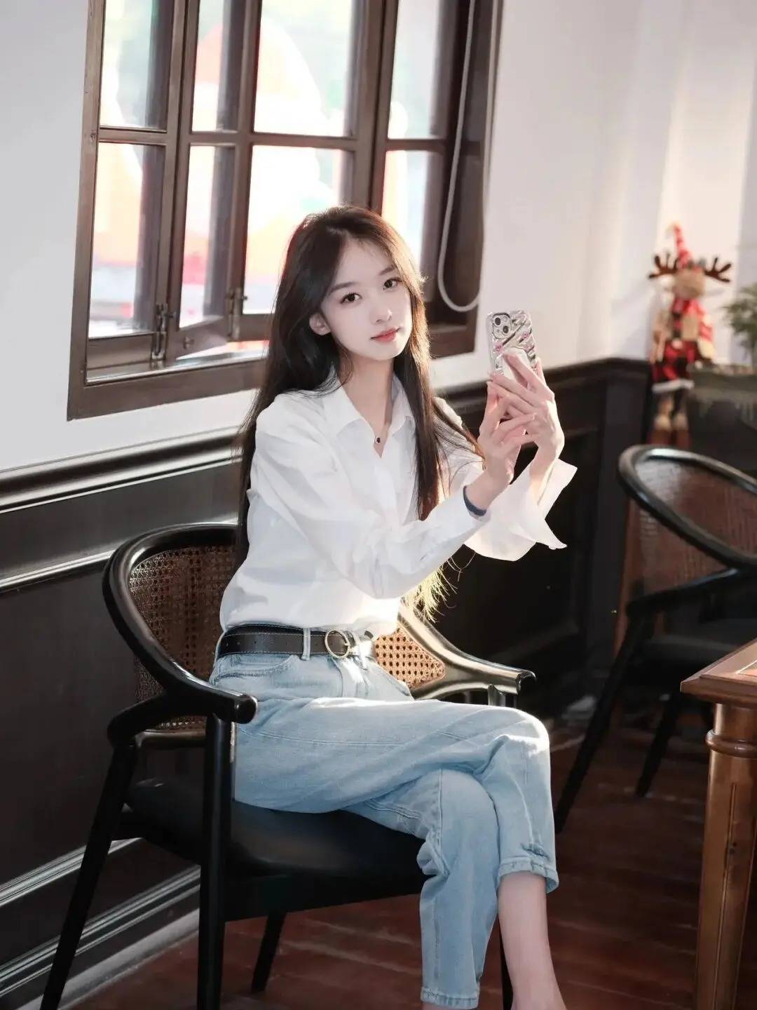 人物坐姿随性,手持手机互动,姿态自然又有生活感。这种姿势巧妙融入场景,利用复古风的室内环境和暖调光影,白衬衫牛仔裤的搭配简约又出挑。加上真实的神态,随手一拍就是文艺感满满的日常大片,学会这招,在咖啡馆这类场景出片轻松又有格调~