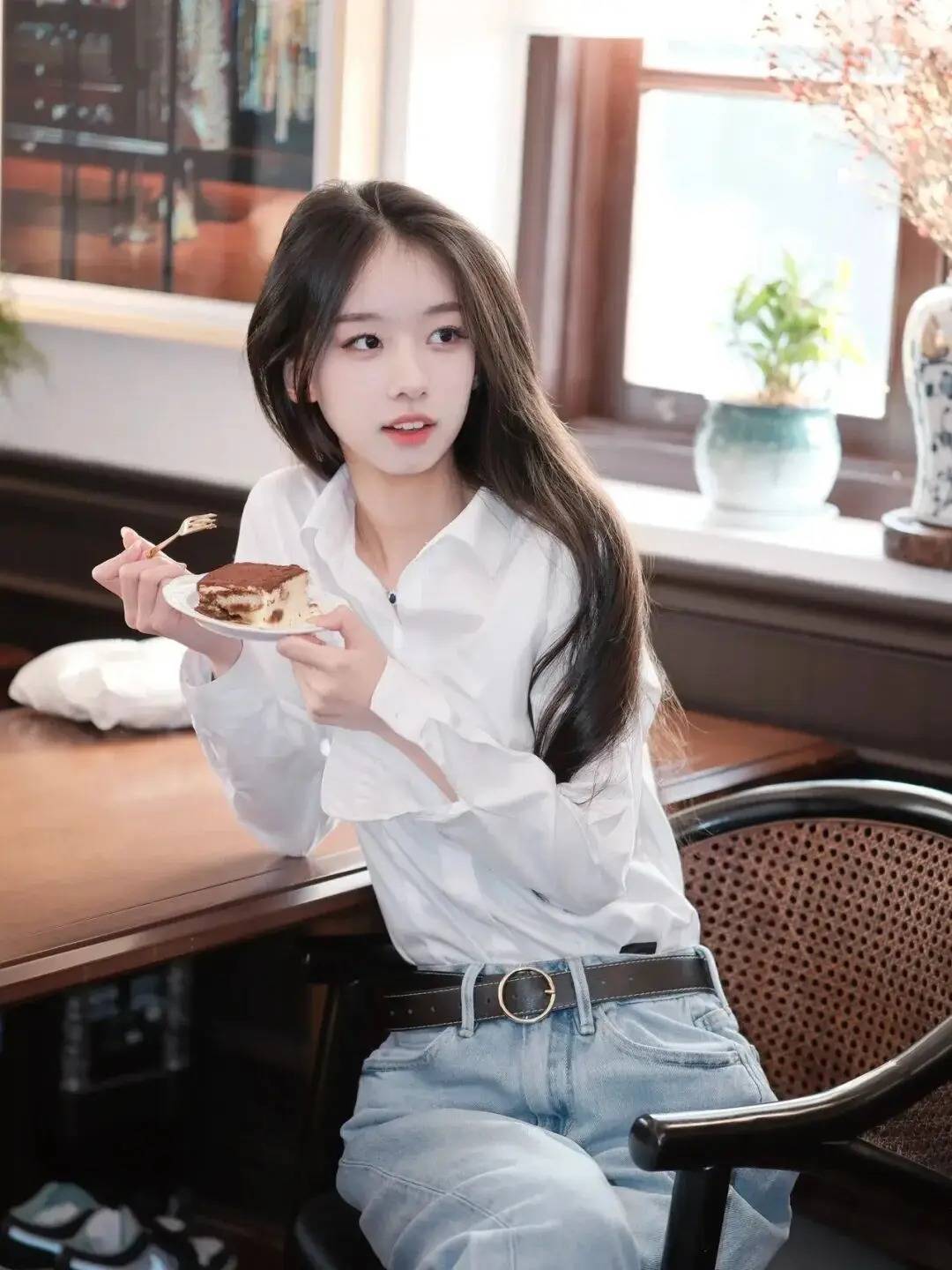 人物手持甜点互动,姿态自然又充满生活气息。这种姿势巧妙融入场景,利用复古风的室内环境和暖调光影,白衬衫牛仔裤的搭配简约又出挑。加上真实的神态,随手一拍就是治愈感满满的日常大片,学会这招,在咖啡馆这类场景出片轻松又有格调~