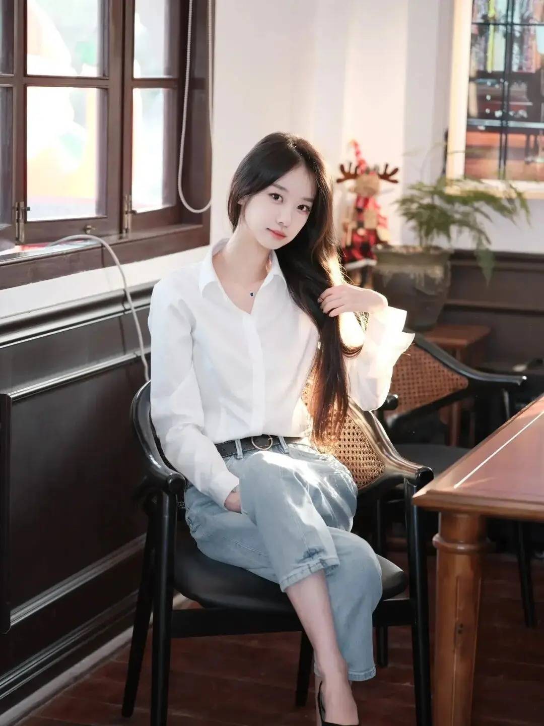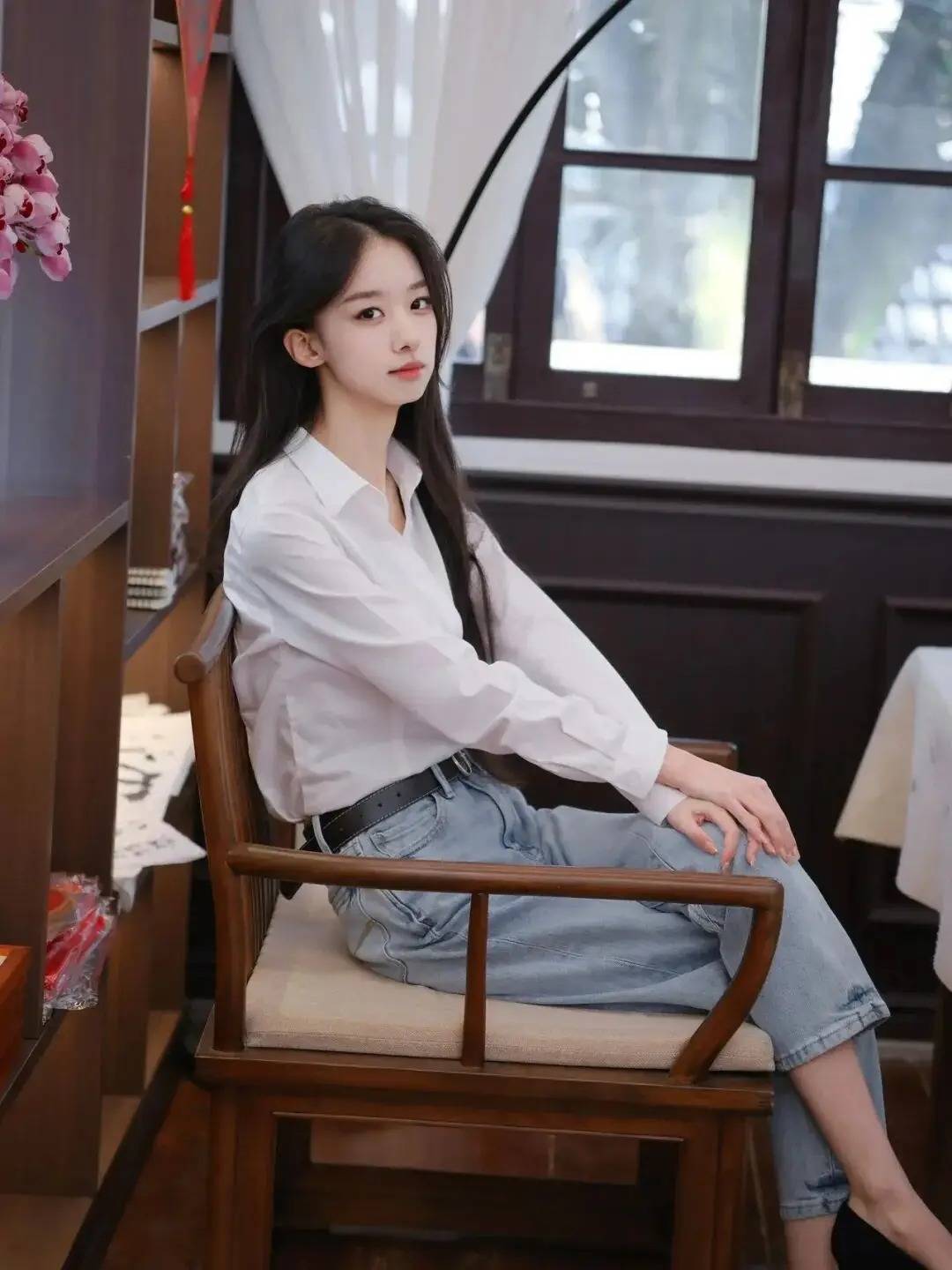 人物优雅坐姿,肢体自然舒展,姿态从容又具氛围感。这种姿势巧妙利用复古座椅的线条,搭配文艺风的室内场景,白衬衫牛仔裤的搭配简约又高级。加上松弛的神态,随手一拍就是质感满满的日常大片,学会这招,在咖啡馆、中式风小店出片轻松又有格调~