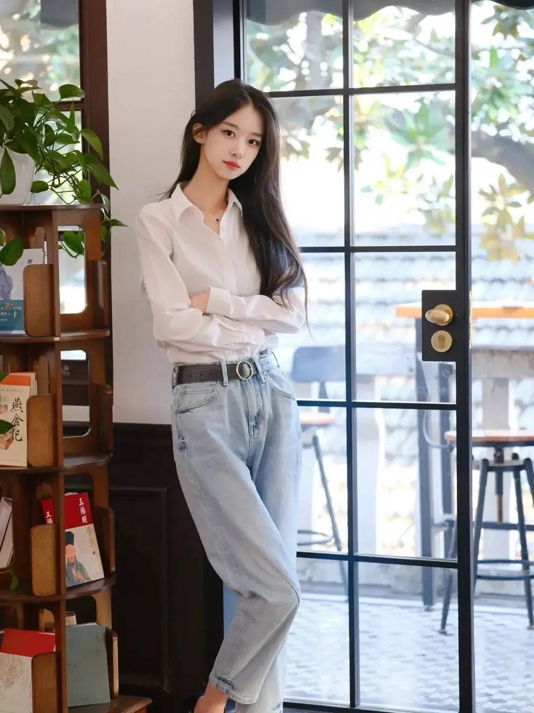 人物双臂交叉,单腿微屈站立,姿态干练又带点随性。这种姿势巧妙利用肢体线条,搭配复古风的室内场景,白衬衫牛仔裤的搭配简约又出挑。加上自然的神态,随手一拍就是文艺感满满的日常大片,学会这招,在咖啡馆、书店这类场景出片轻松又有格调~