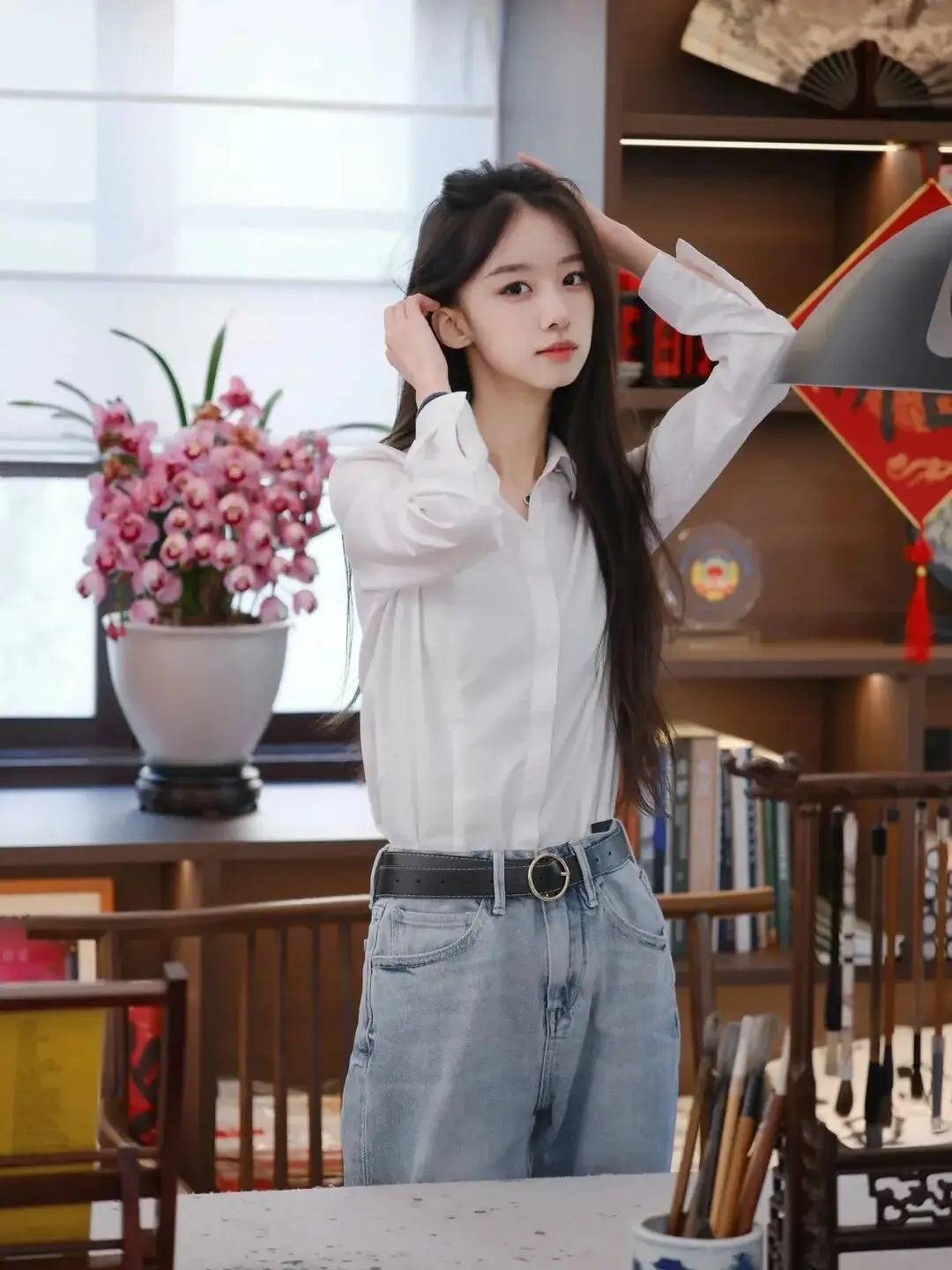 人物双手拨弄发丝,姿态灵动又显活力。这种姿势巧妙利用肢体细节,搭配充满文艺感的室内场景,白衬衫牛仔裤的搭配简约又出挑。加上自然的神态,随手一拍就很有生活气息,学会这招,在书房、文艺小店这类场景出片轻松又吸睛~