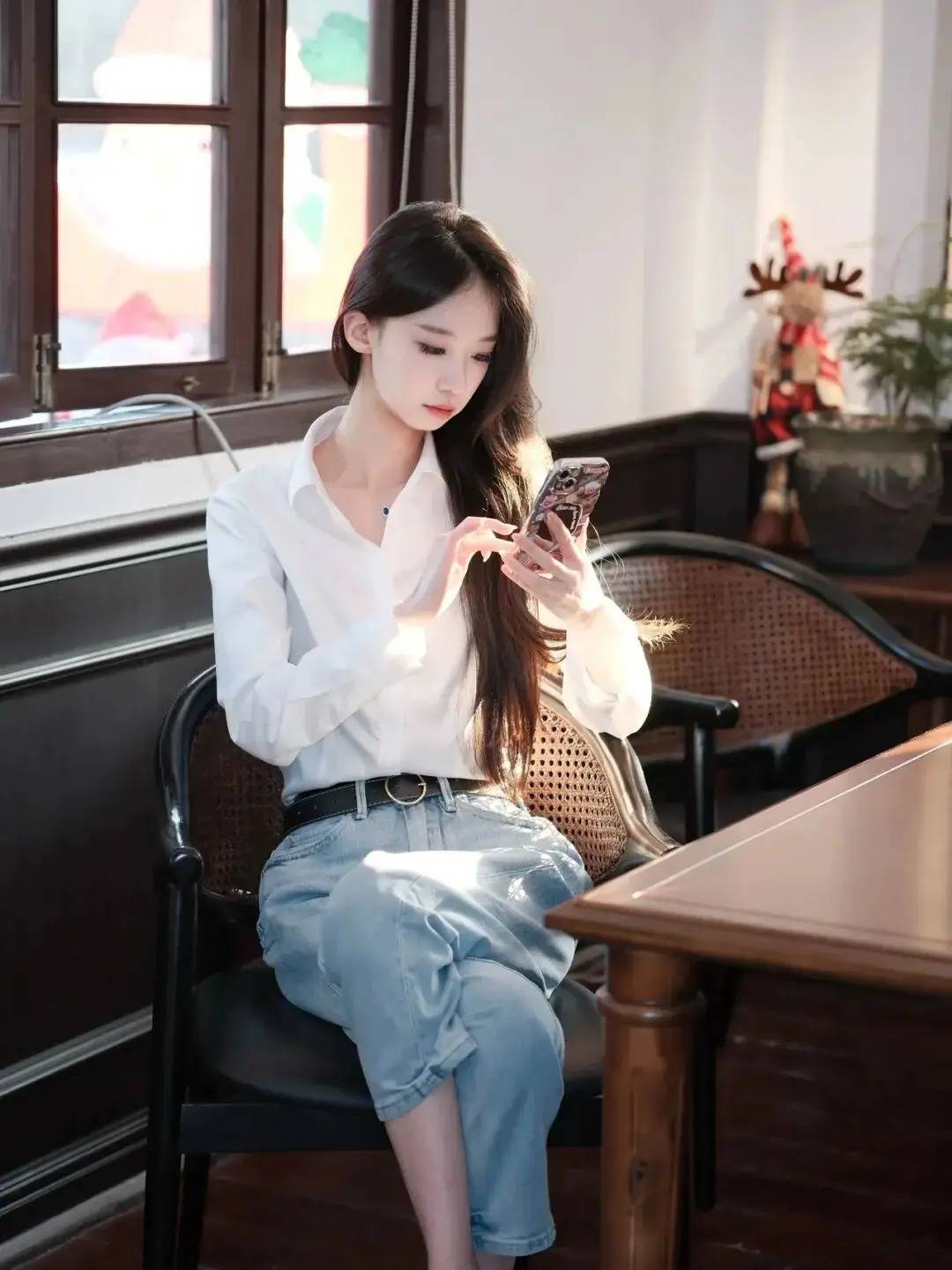 人物专注玩手机,姿态自然又有生活感。这种姿势巧妙融入复古场景,利用暖调光影和细节满满的环境,白衬衫牛仔裤的搭配简约又出挑。加上松弛的神态,随手一拍就是治愈感满满的日常大片,学会这招,在咖啡馆这类场景出片轻松又有格调~